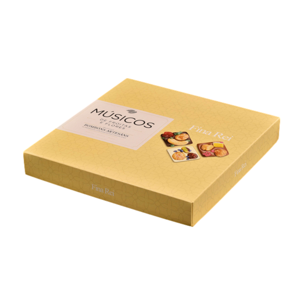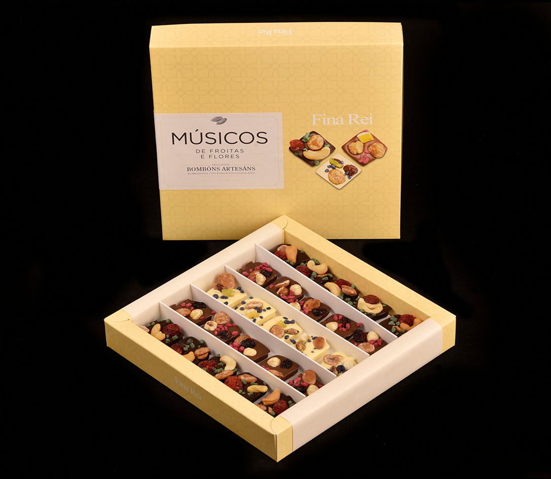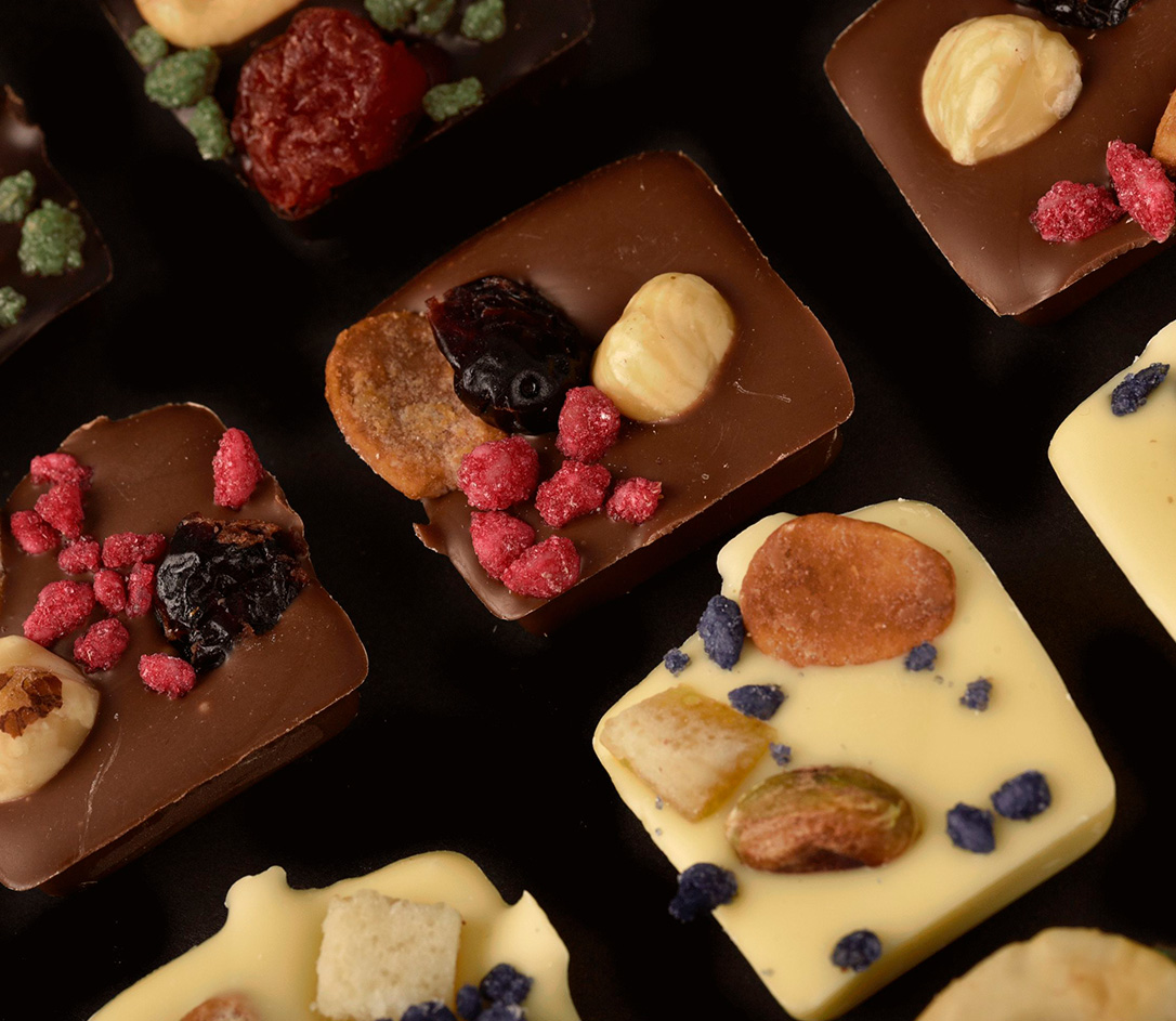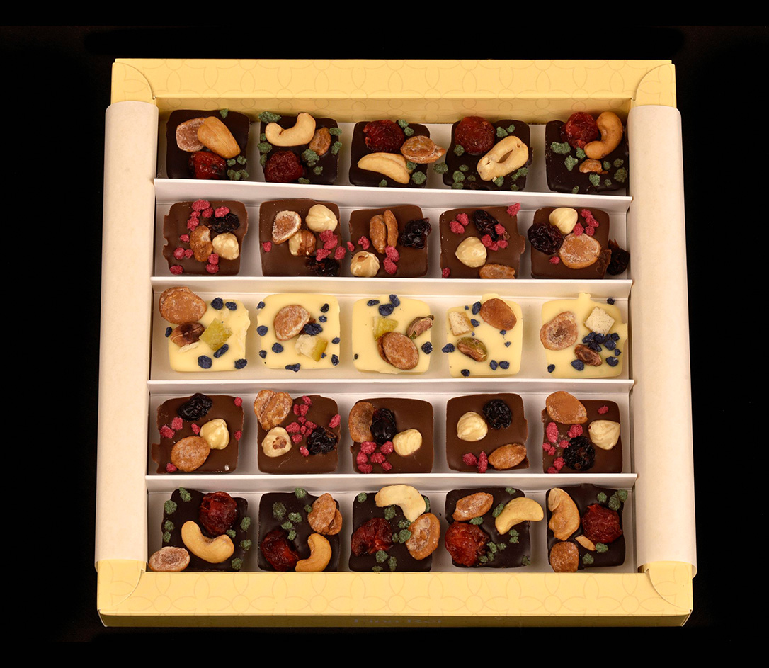 INGREDIENTES: cobertura de chocolate 70% cacao***, cobertura de chocolate con leche 40% cacao**, cobertura de chocolate blanco 31% cacao*, almendra, avellana, anacardo, pistacho, cereza, arándano, mango, flor de menta, flor de rosa, flor de violeta.