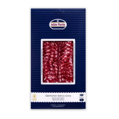Sobres de Salchichón Ibérico de Cebo loncheados a máquina y envasados al vacío en formatos individuales de 100 g. Deliciosas lonchas listas para consumir en cualquier momento gracias a su cómodo formato que conserva intactas todas sus cualidades.